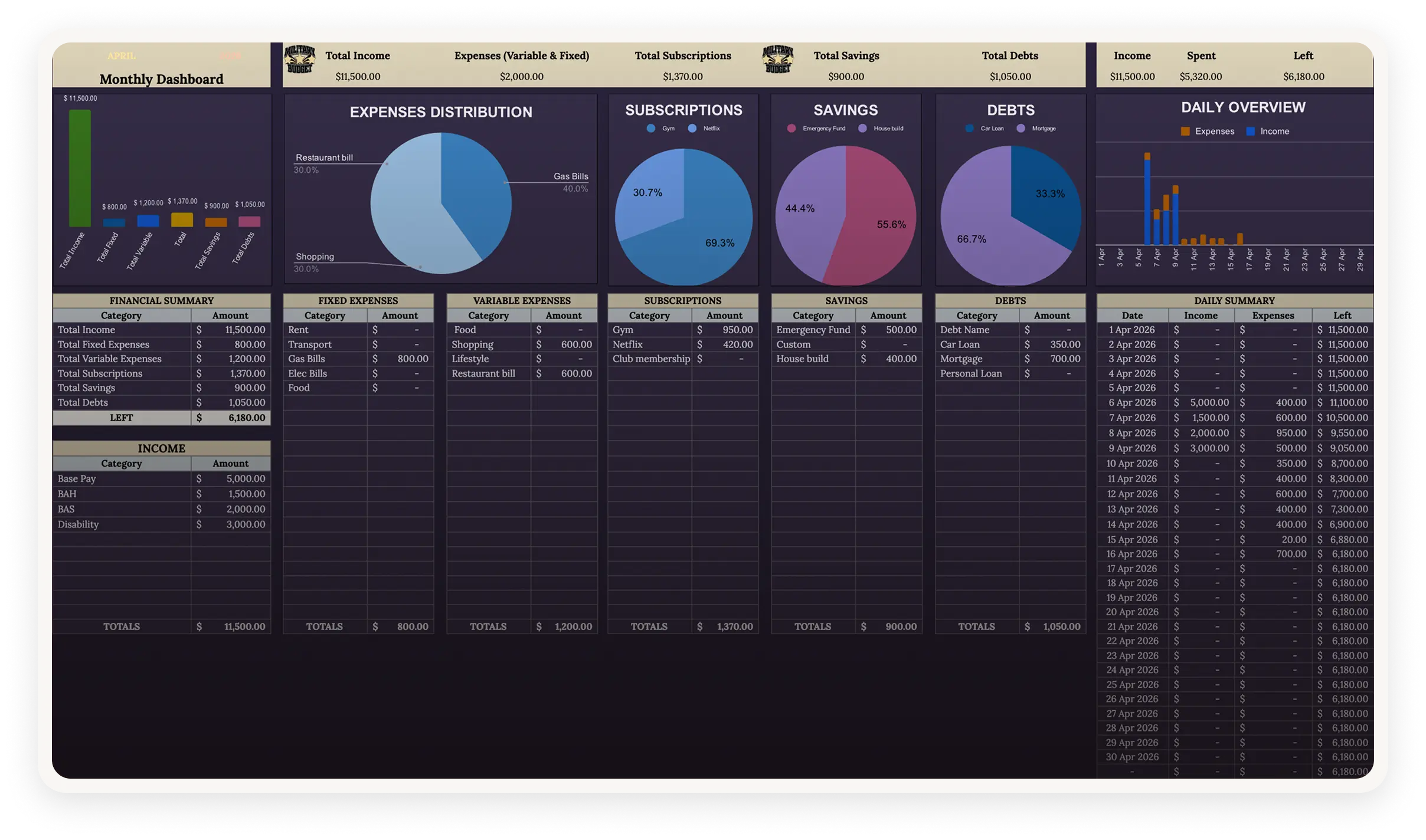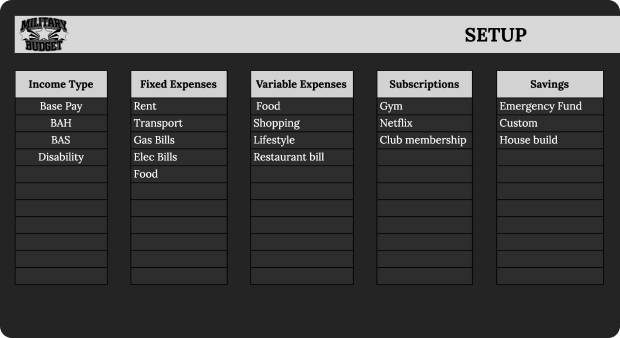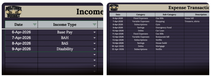 Keep track of every dollar coming in and going out. Built around military pay-Base Pay, BAH, BAS, Disability-so it actually fits your situation.