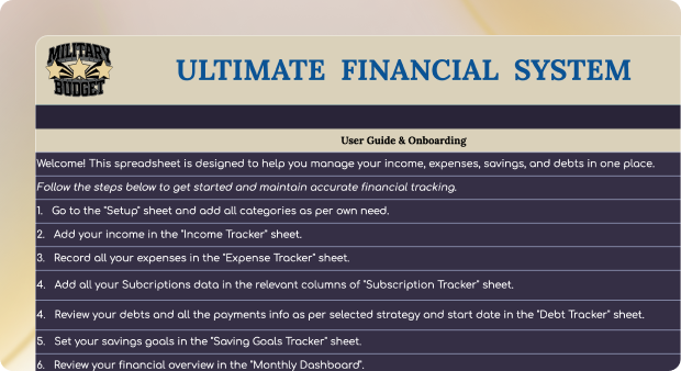 Stay on top of your income, expenses, debt, and savings with a simple Google Sheets system made specifically for service members.