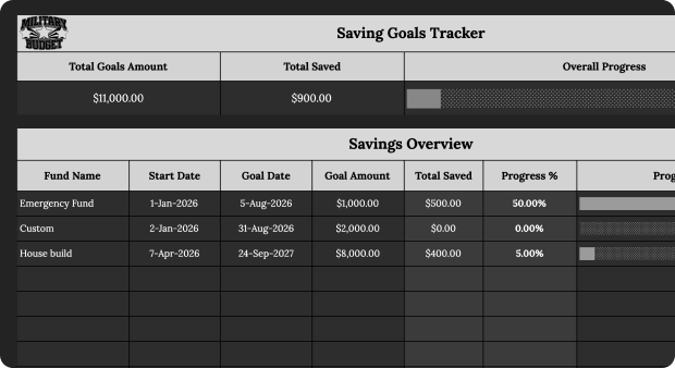 Set your goals and actually see your progress. Whether you're building an emergency fund, saving for a PCS, or planning ahead, this keeps you accountable.